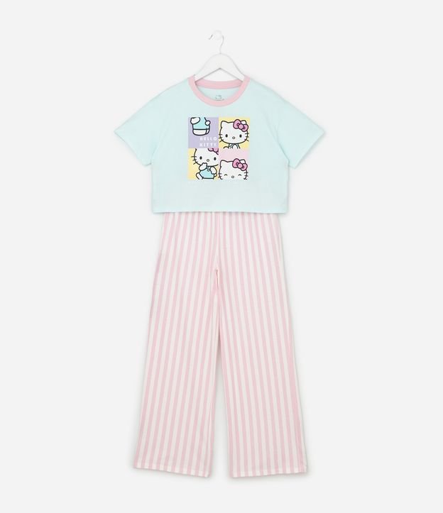 Pijaminha infantil confeccionado em algodão mais sustentável através de boas práticas ambientais. Possui camiseta de gola redonda, manga curta, com estampa da Hello Kitty, modelo cropped e calça com elástico, estampa de listras, modelo wide leg.