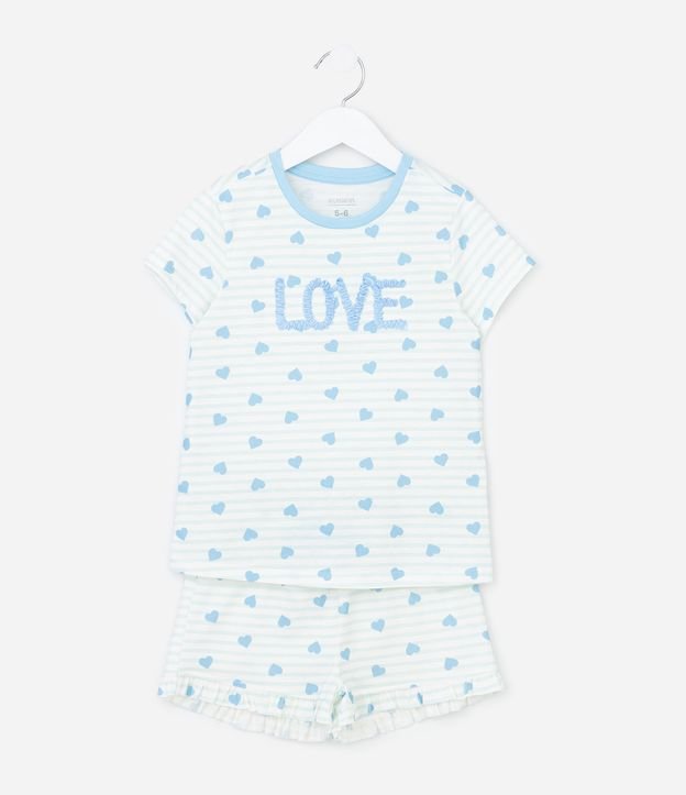Pijama Infantil Curto com Estampa De Corações e Bordado Love - Tam 2 A 10 Anos Branco/Azul