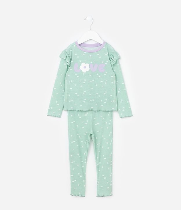 Conjunto de pijaminha infantil confeccionado em ribana, com gola redonda, manga longa, babadinhos nos ombros e bordado no peito com lettering "Love". Possui estampa de fundo floral e frufru nas bordas, super delicado.