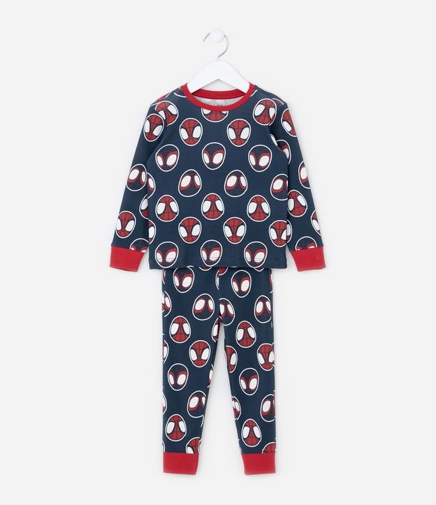 Conjunto de pijama infantil confeccionado com ribana de algodão mais sustentável: uma blusa manga longa e uma calça com barra ajustada, ambos com estampa da carinha do Spidey.