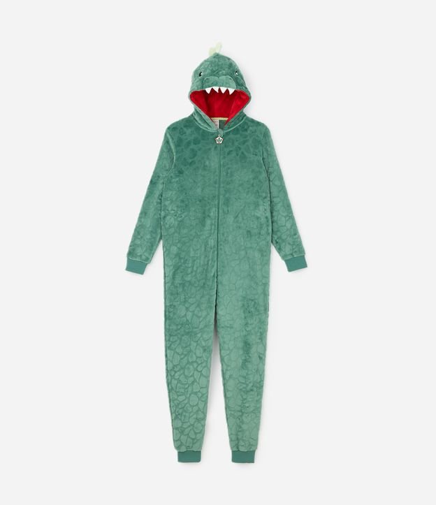 Pijama infantil estilo jumper confeccionado em fleece macio com textura burnout que imita pele de dinossauro. Possui capuz com elementos 3D, zíper frontal e punhos ajustados, garantindo conforto e diversão nas noites frias. Material mais sustentável: Poliéster Certificado GRS.