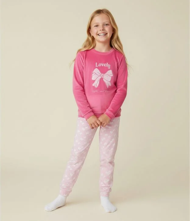 Pijama infantil longo confeccionado em plush macio com estampa localizada de laço na blusa e gola redonda com mangas longas. Acompanha calça com cós elástico e padronagem de laços em relevo, oferecendo estrutura suave adequada para noites de descanso.