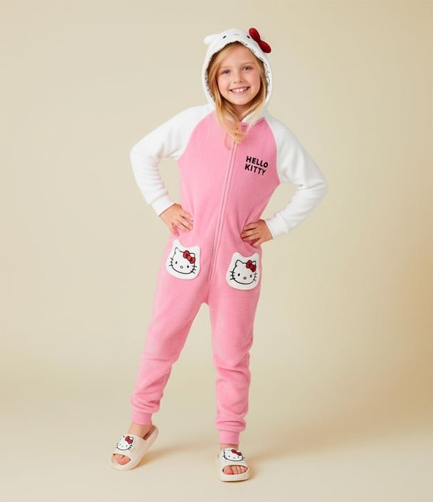 Pijama infantil longo, de modelo jumper e confeccionado em fleece quentinho. Possui zíper frontal e capuz com bordado da Hello Kitty com orelhinhas e lacinho.