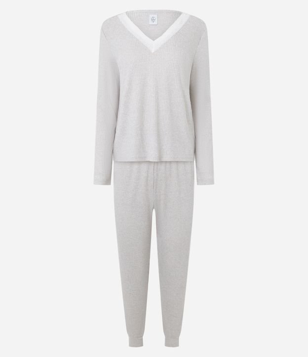 Pijama feminino confeccionado em ribana. Possui 02 peças: blusa com mangas longas, decote em v contrastante e renda delicada aplicada; e calça confortável com cós elástico.