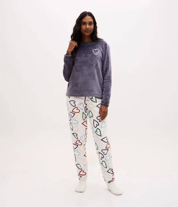 Blusa de manga longa em tecido felpudo, com modelagem reta, gola fechada e bordado de coração no peito. Calça comprida de toque macio, cós elástico e estampa repetida de corações por toda a peça. Conjunto feito para oferecer sensação aconchegante, com caimento solto e acabamento confortável.