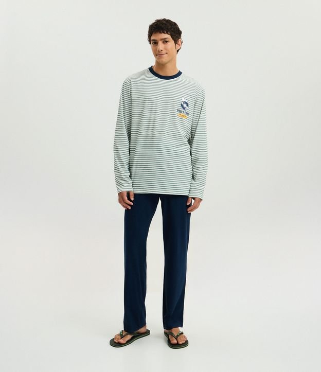 Pijama Longo em Algodão Listrado com Estampa Snoopy e Calça de Pijama Verde