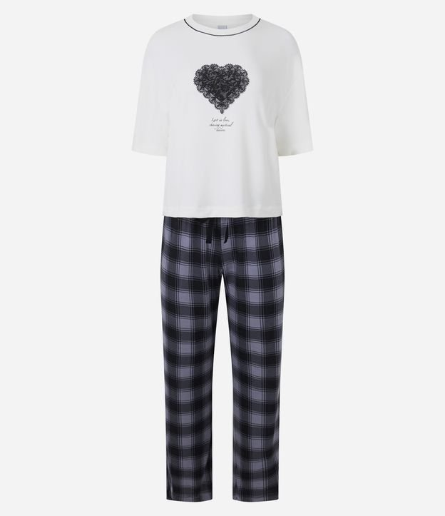 Pijama longo confeccionado em moletinho sem felpa, blusa manga curta com estampa de coração e calça xadrez com cordão no cós elástico.