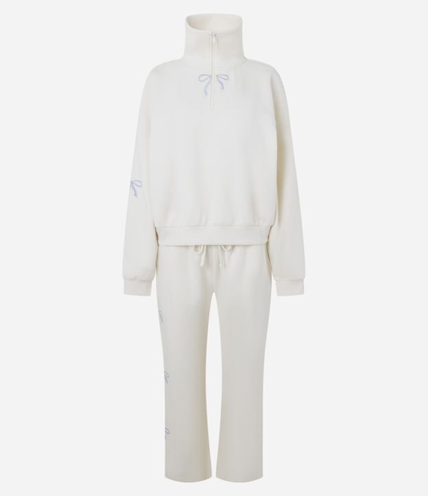 Pijama Longo em Moletom com Bordado de Laços Bege