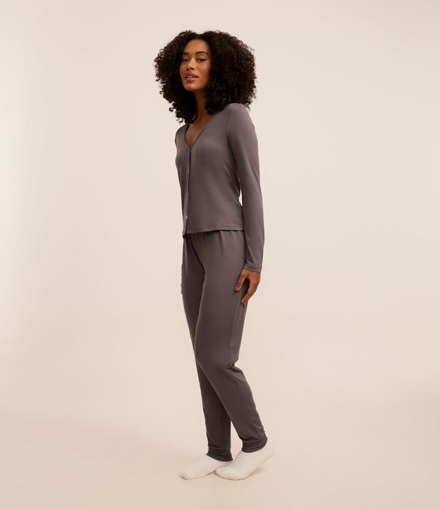 Pijama Longo em Peach Touch Básico com Botões Cinza