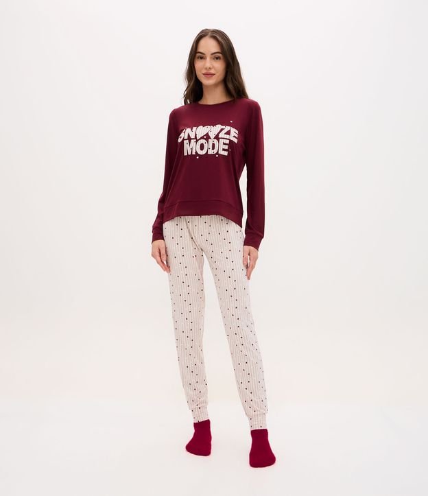 Pijama Longo em Peach Touch com Estampa Poá Vinho