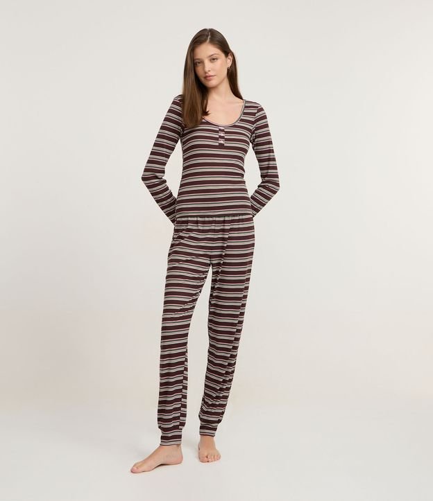 • Pijama Longo em Ribana com Estampa Listrada Marrom 1