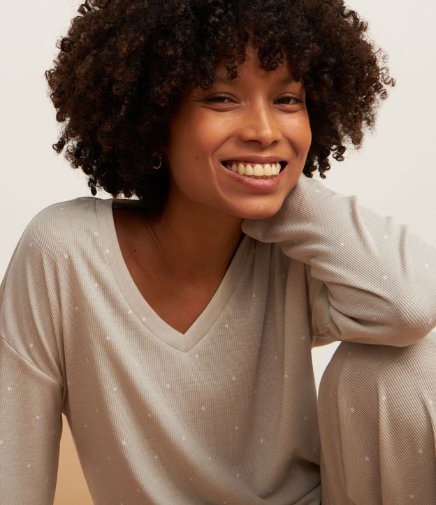 Pijama longo feminino, confeccionado em ribana, com blusa manga longa, gola V, calça cós elástico e superfície sem estampa.