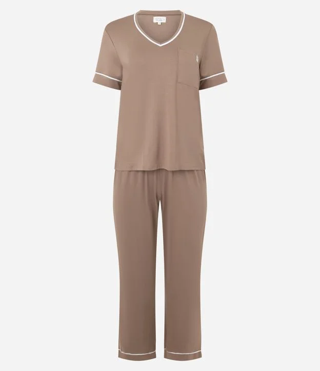 Pijama feminino confeccionado em viscolycra mais sustentável, no modelo longo regular. Composto por duas peças, blusa com decote v, manga curta, bolsinho com etiqueta aplicada e calça com cós elástico. Ambos sem estampa e com detalhes contrastantes.