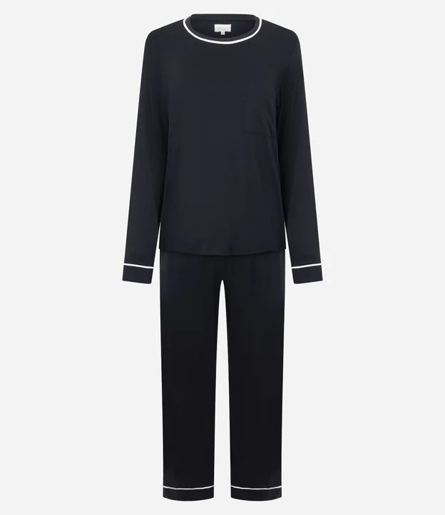Pijama Longo em Viscolycra com Viés Contrastante Preto