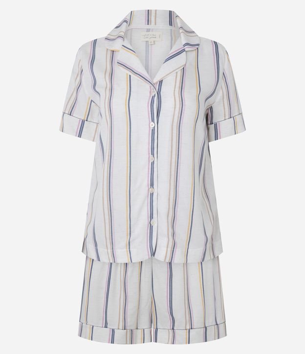 Conjunto de pijama americano curto confeccionado em viscose certificada. São duas peças: blusa manga curta com gola lapela, abotoamento frontal; e short com cintura elástica. Tudo estampado com listras contrastantes.