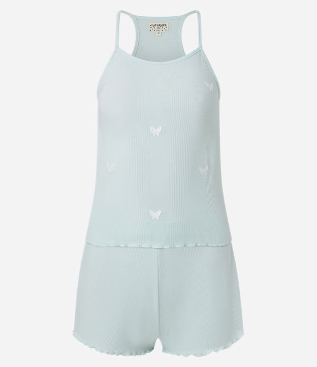 Conjunto de pijama feminino confeccionado em ribana mais sustentável através de boas práticas ambientais. Composto por duas peças: regata com decote em U, alças finas e estampa de mini borboletas bordadas; e short liso, com cós elástico.