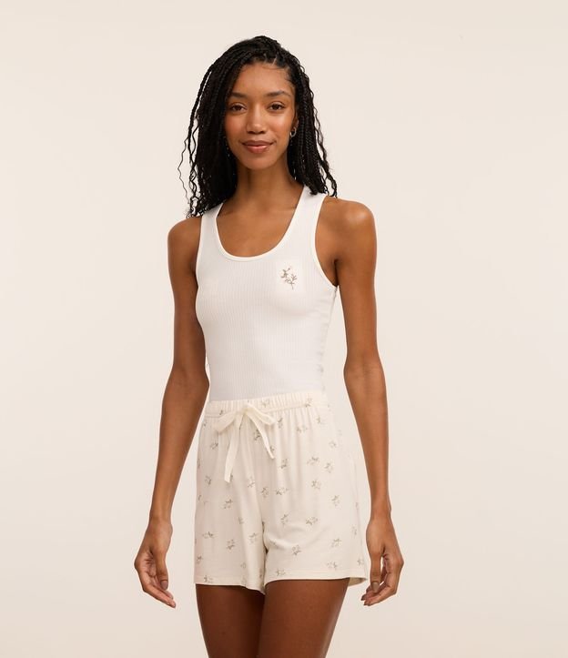 Pijama Short Doll em Ribana com Bordado e Short Estampado Floral Off White