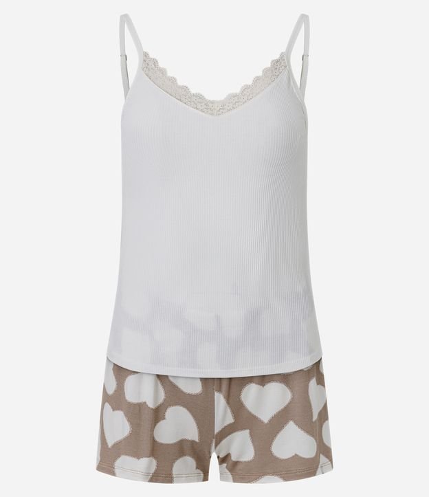 Pijama Short Doll em Viscose com Rendinha e Short com Estampa de Coração Branco