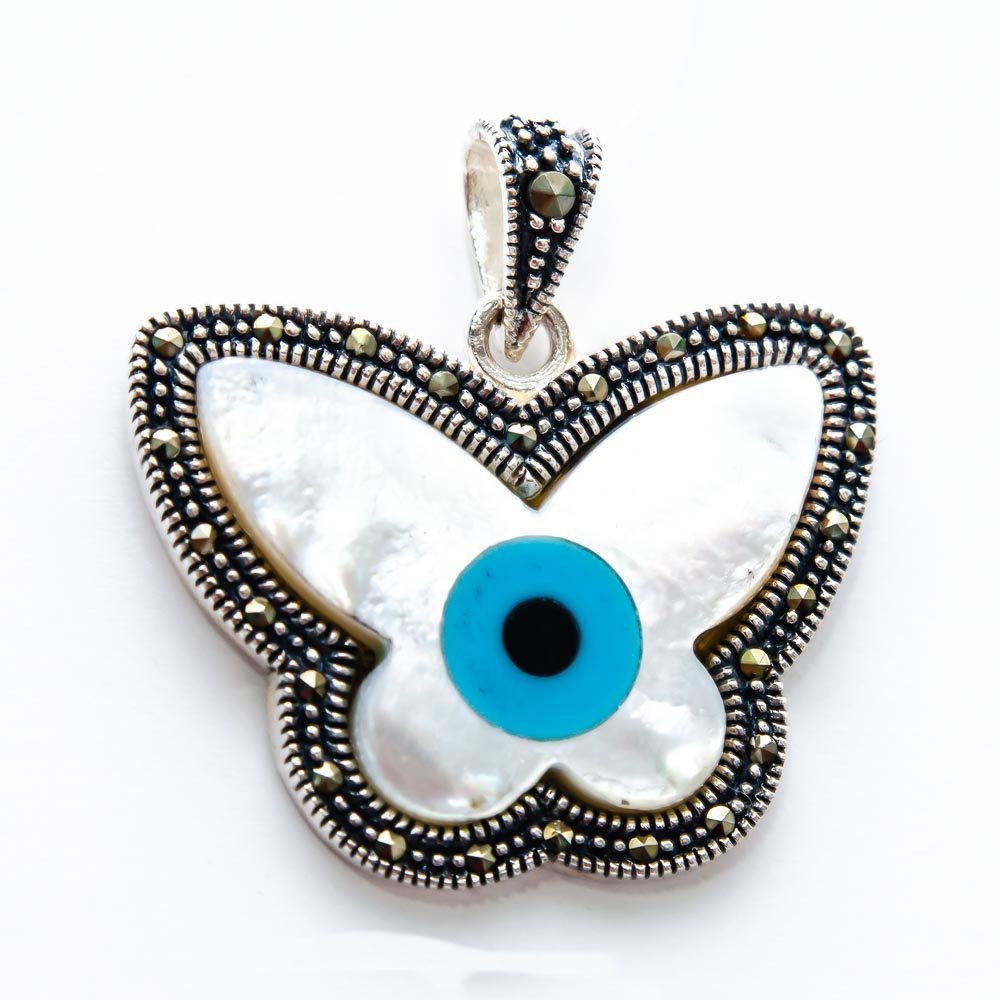 Pingente de Borboleta em Prata de Bali com Madre Pérola e Olho Grego Prata