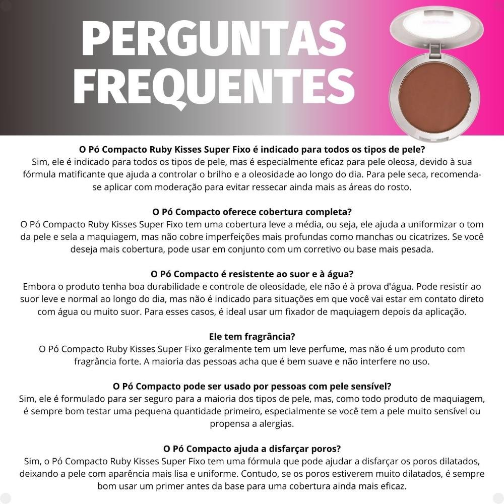 O Pó Compacto Ruby Kisses Super Fixo tem uma cobertura leve a média, ou seja, ele ajuda a uniformizar o tom da pele e sela a maquiagem, mas não cobre imperfeições mais profundas como manchas ou cicatrizes. Se você deseja mais cobertura, pode usar em conjunto com um corretivo ou base mais pesada.