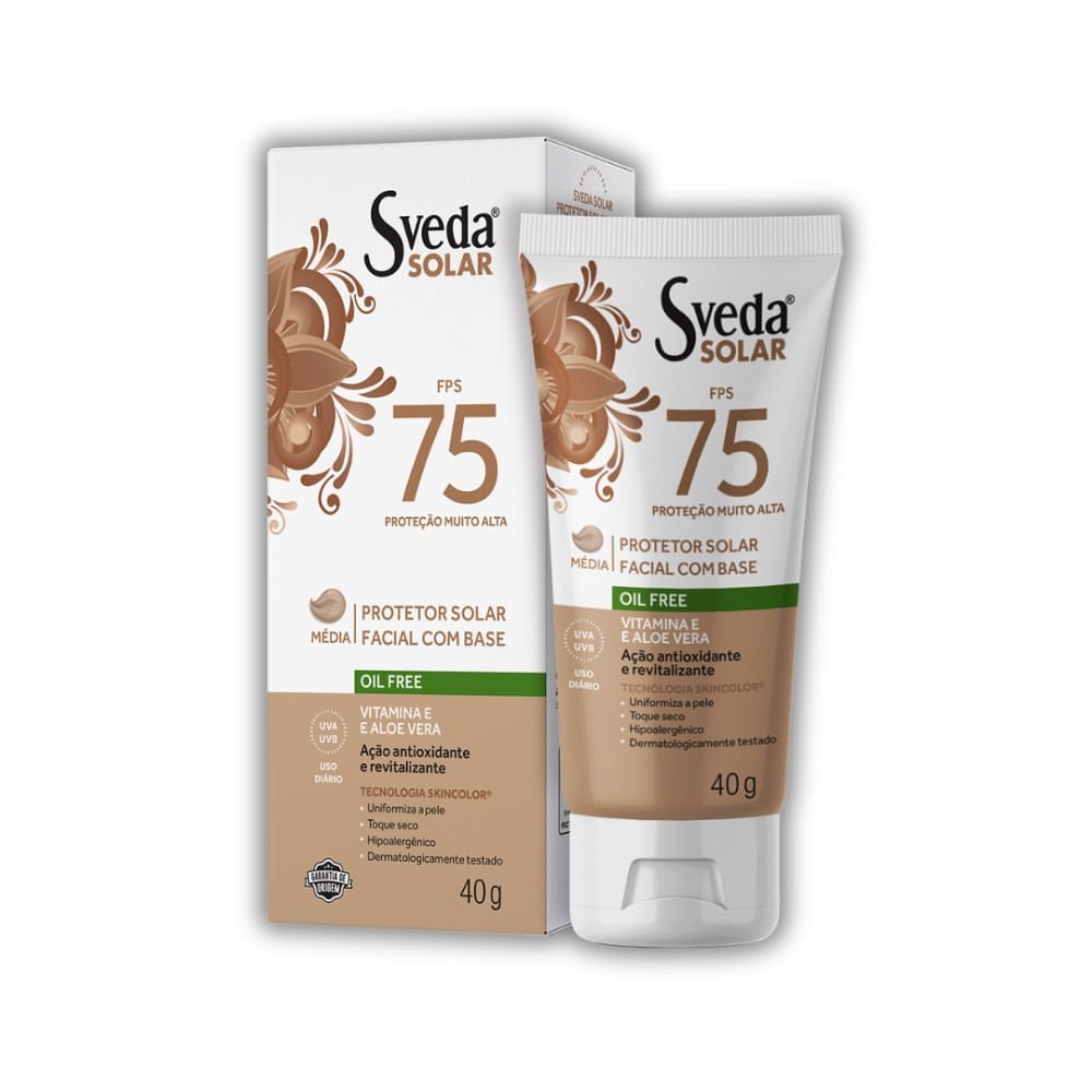 O Protetor Solar Facial Sveda FPS 75 Base Média oferece proteção muito alta contra os raios UVA e UVB, prevenindo queimaduras solares e o envelhecimento precoce. Com a Tecnologia SkinColor, adapta-se ao tom da pele, garantindo cobertura uniforme e natural. Sua fórmula oil-free e acabamento mate controla a oleosidade, sendo ideal para peles mistas e oleosas, enquanto Vitamina E e Aloe Vera promovem hidratação e ação antioxidante.