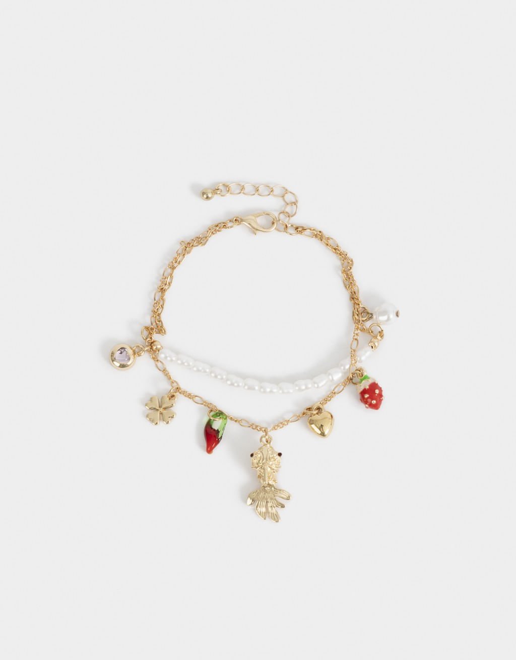 Pulseiras flexíveis x2 camadas de pérolas e pingente de peixe, morango e pimenta.