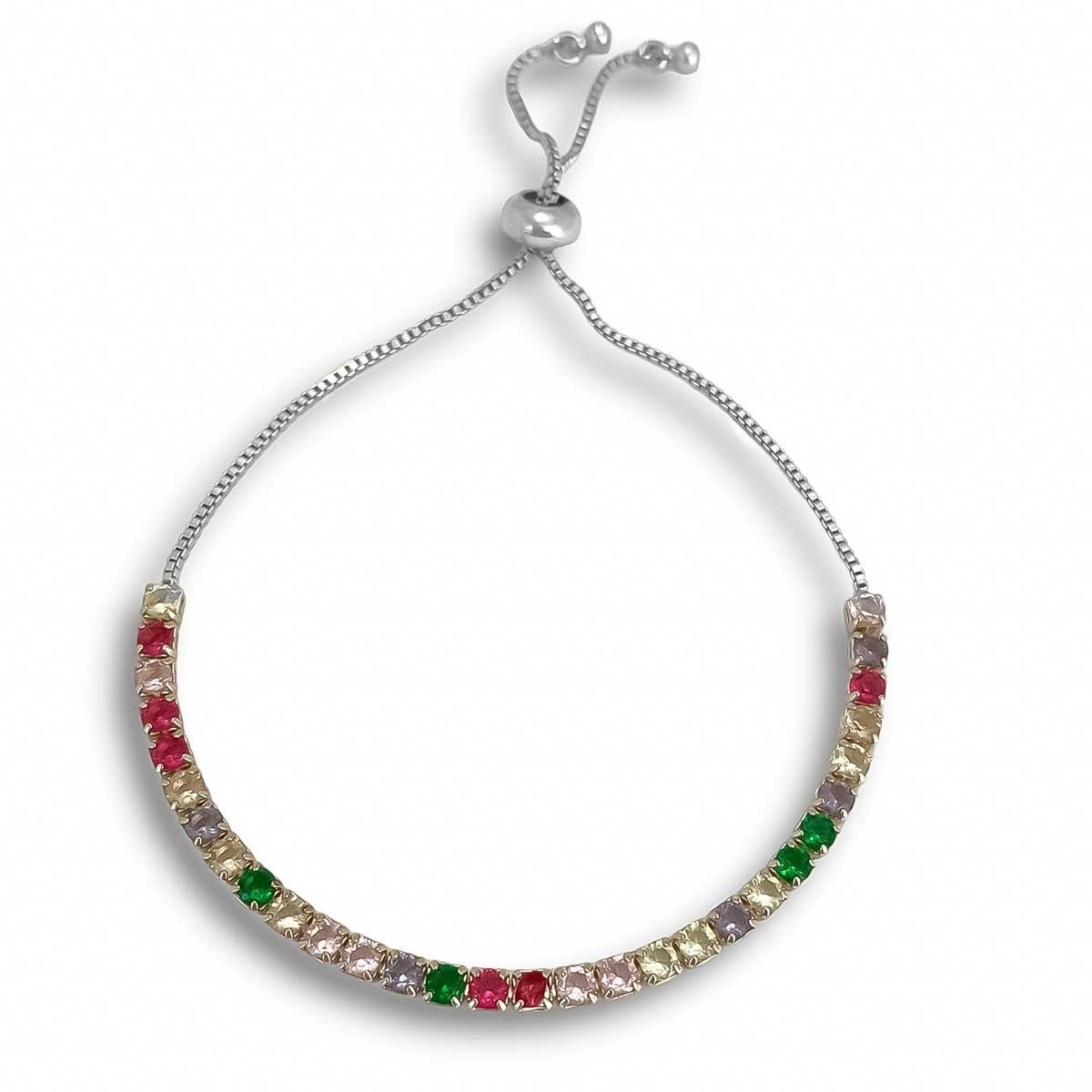 Pulseira Regulavel Riviera de Zirconia Colorida Banhada a Prata Semijoia Prata