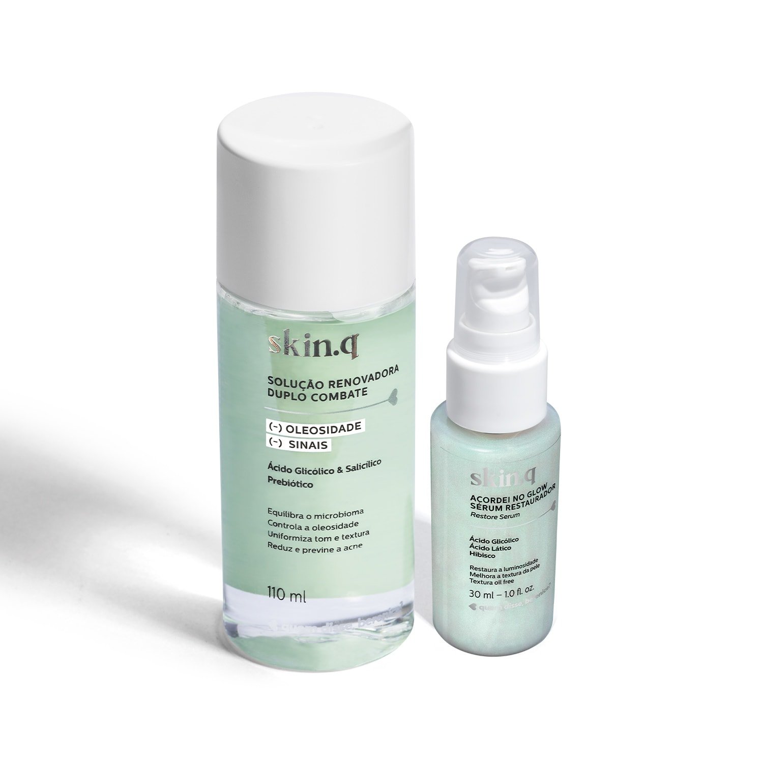 O Combo Skin.q: Sérum Restaurador + Solução Renovador Facial entrega a dupla de produtos ideais para uma pele restaurada, hidratada e limpa diariamente. Além de garantir oleosidade controlada sempre que sua pele precisar.