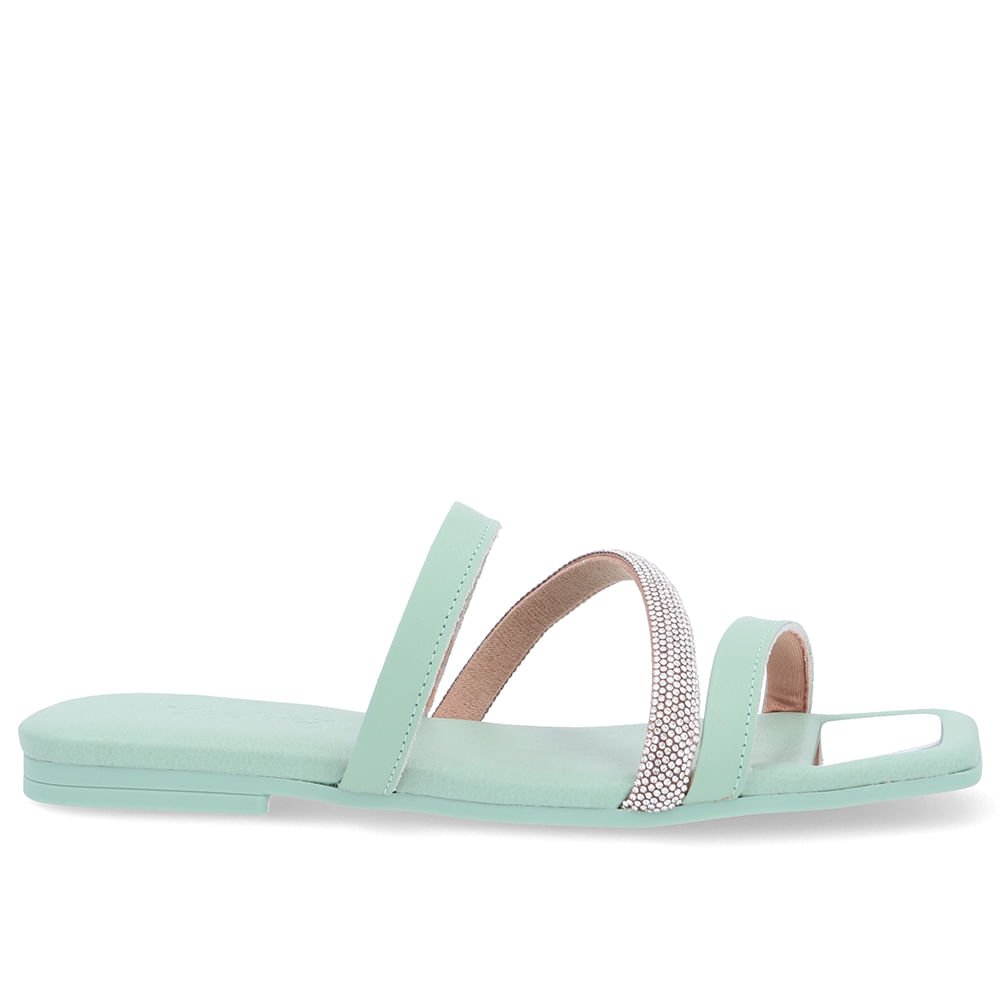 Rasteira Bico Quadrado Couro Verde Strass Verde