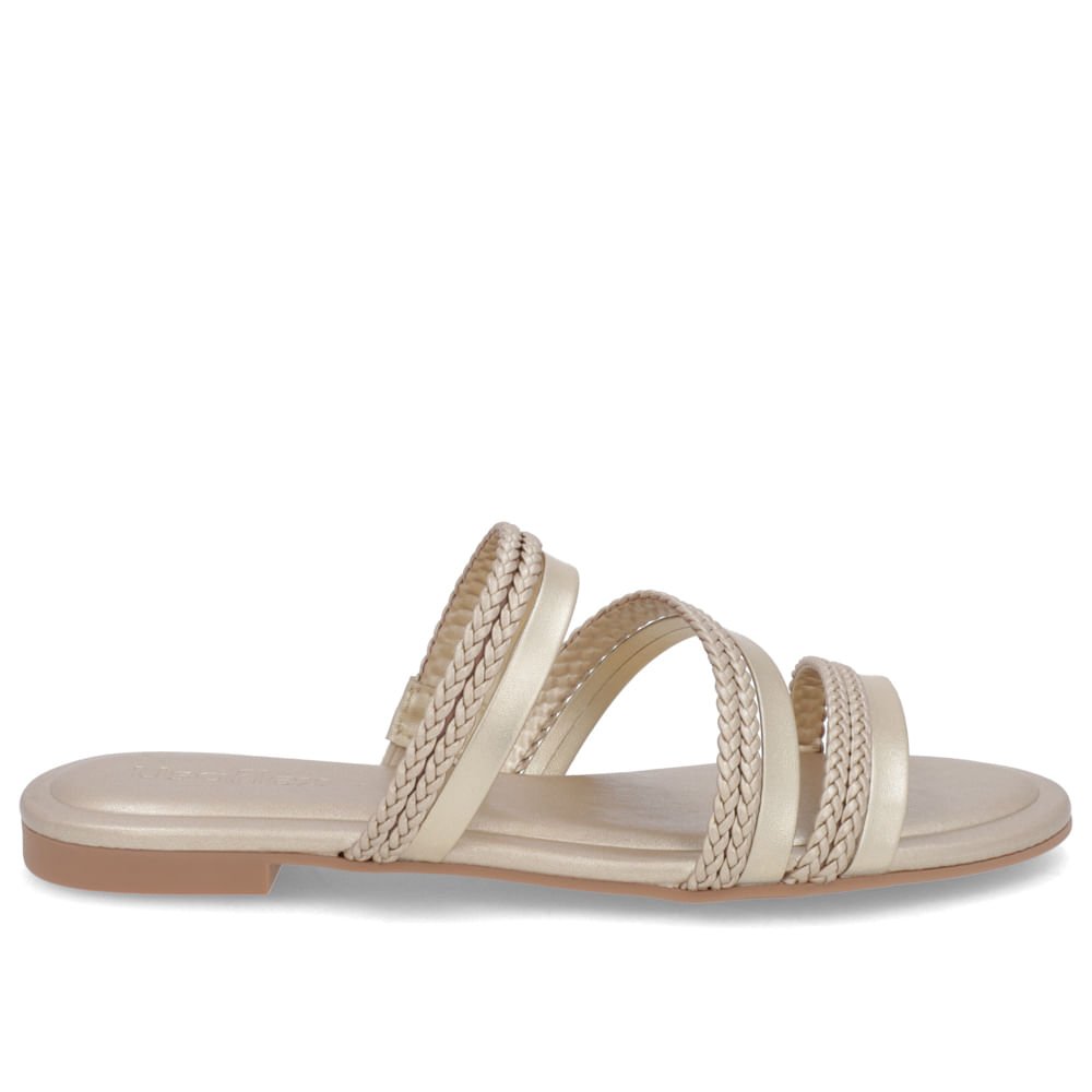 Rasteira Bico Redondo Couro Dourado Tiras Trançadas