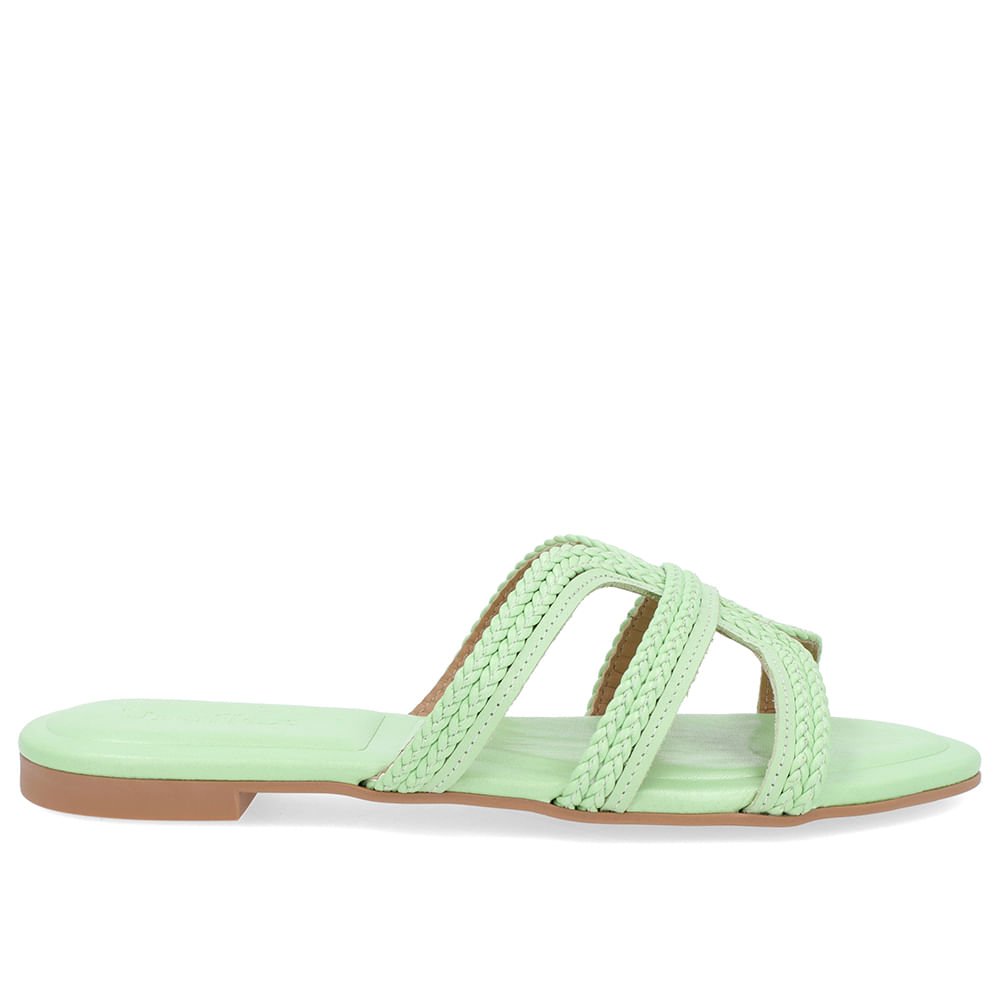 Rasteira cabedal com tiras confeccionada em multimateriais na cor verde mentolado, modelo com solado rasteiro, é delicado e elegante, podendo ser usado em diversas ocasiões de uso.