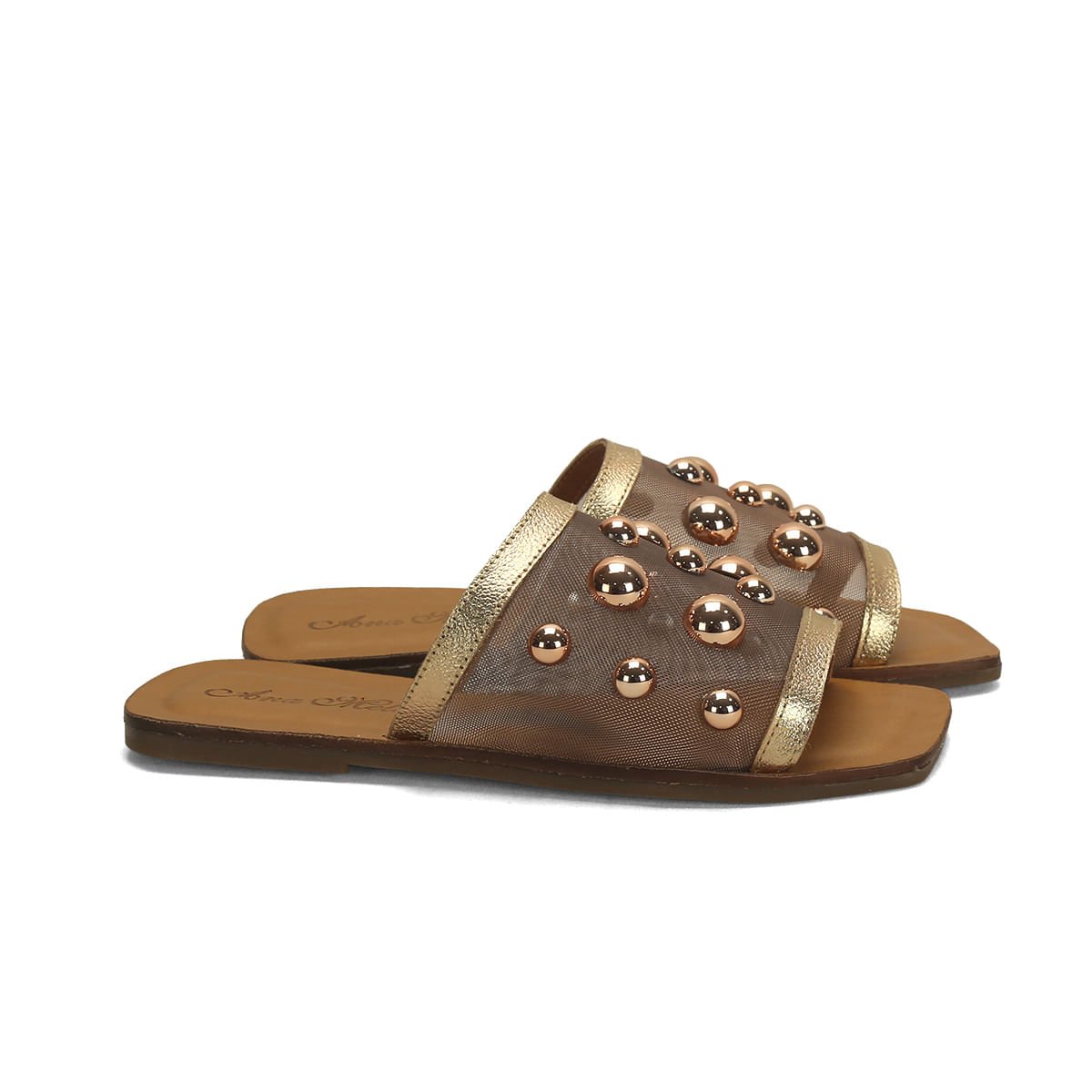 • Rasteira couro caramelo com tela rosê detalhe bolas