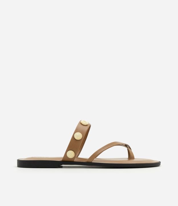Rasteira feminina em PU com tiras finas cruzadas na parte frontal e tira central contornando o peito do pé. O modelo traz aplicação de enfeites em formato de moedas.