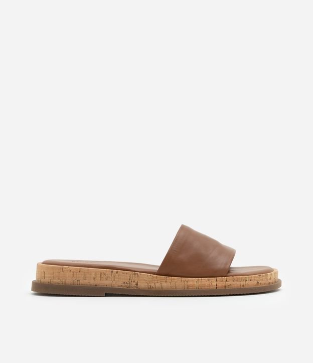 Rasteira feminina confeccionada em couro. Possui gáspea larga e lisa, bico redondo, salto baixo. Palmilha com logo da marca e solado emborrachado.