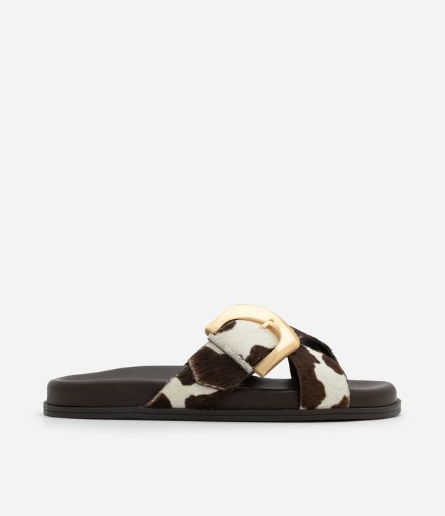 Rasteira feminina confeccionada em couro. Possui tiras largas cruzadas com estampa animal print peluciada, fivela grande e solado tratorado.