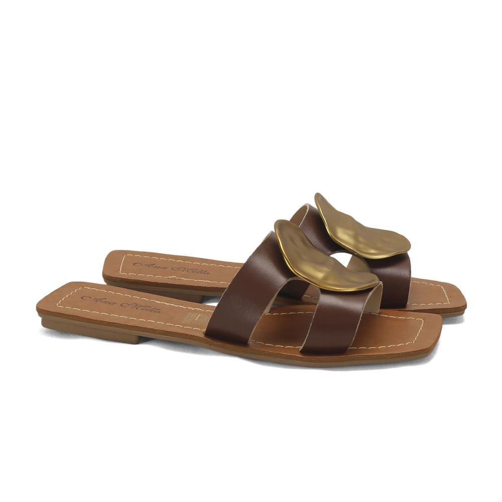 Rasteira na cor Café (marrom escuro) com detalhe em metal orgânico no cabedal (design abstrato/irregular).