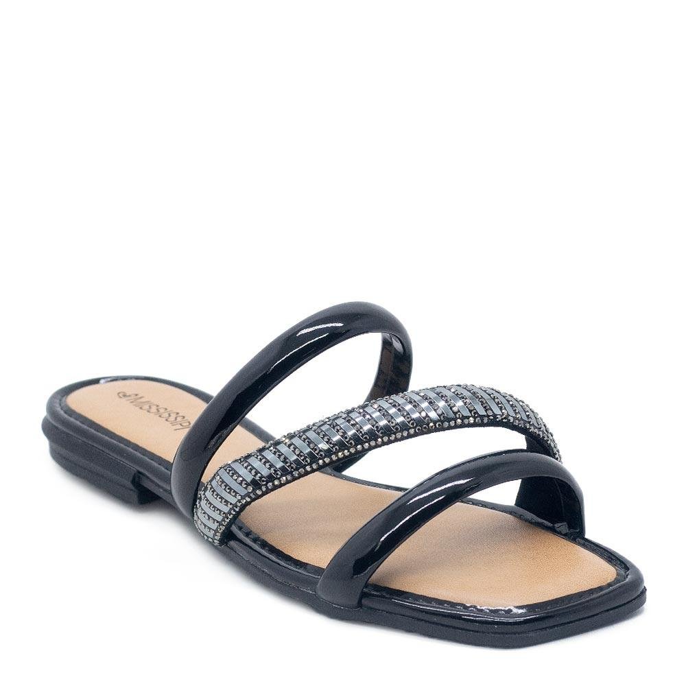 A Rasteira Feminina Mississipi Q8841 Preta é perfeita! Seu design apresenta tira frontal com aplicação de strass, palmilha acolchoada super macia e solado em PVC.