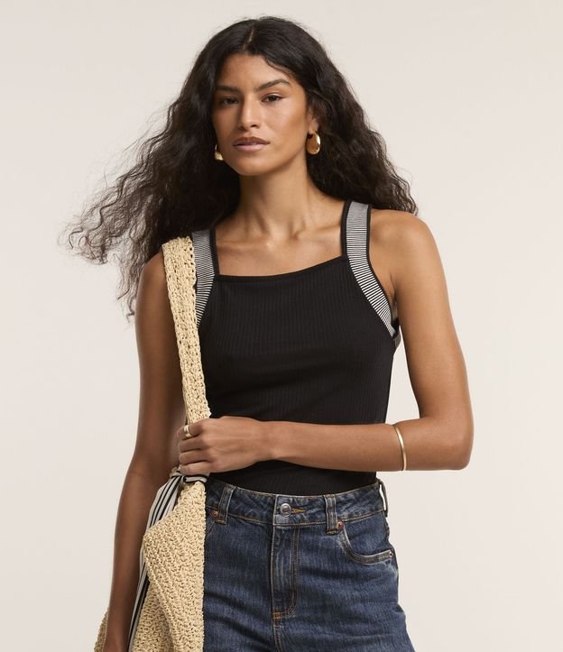 Regata com Decote Quadrado e Alça Contrastante Preto
