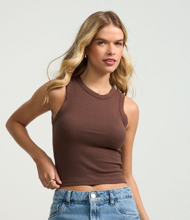 Regata Cropped Básica em Ribana Canelada Marrom Médio