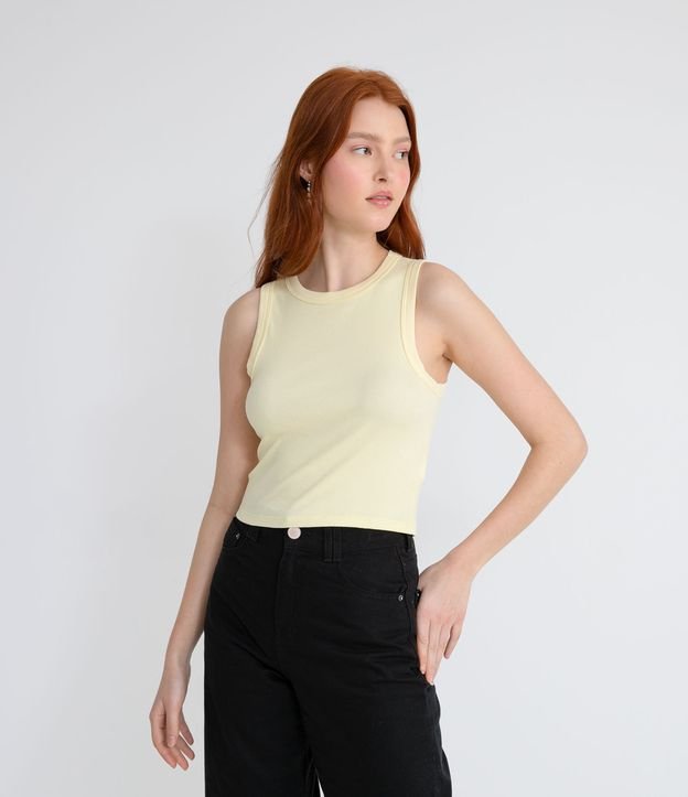 Blusa básica feminina, modelo regata cropped, confeccionada em ribana de viscose. Sem estampa, possui textura caneladinha.