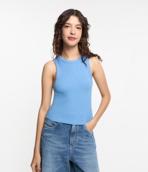 Blusa básica feminina, modelo regata cropped, confeccionada em ribana de viscose. Sem estampa, possui textura caneladinha.