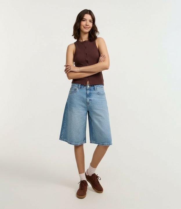 Blusa sem mangas confeccionada em ribana com algodão certificado BCI. A peça tem gola redonda e abotoamento frontal.