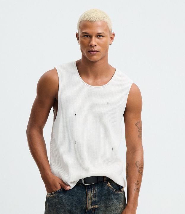 • Regata em Tricô Texturizado com Puídos Branco 1