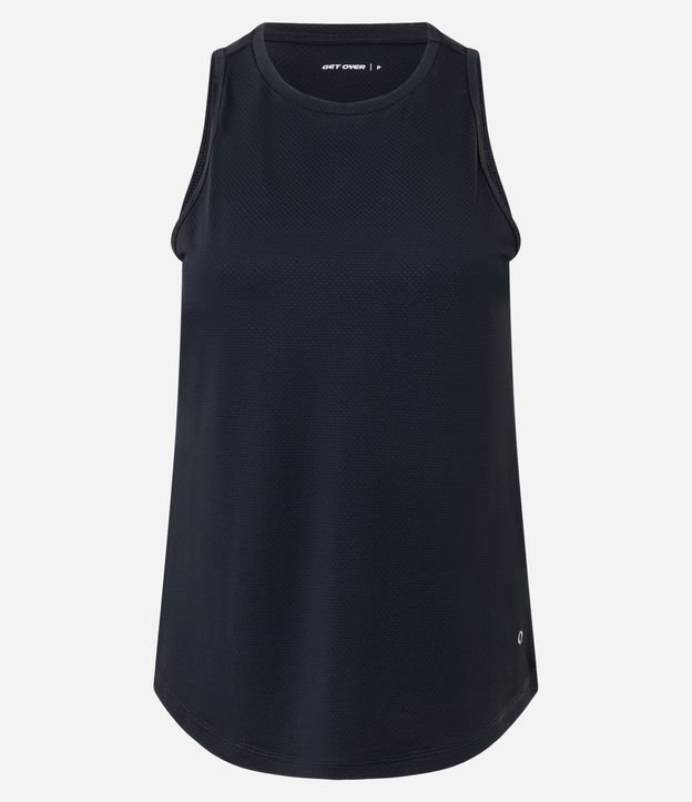 Blusa esportiva sem mangas com gola redonda e barra arredondada.