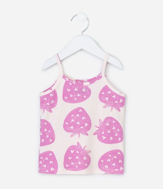 Blusinha infantil confeccionada em malha ribana de algodão, com golinha redonda e alças finas. Possui textura caneladinha e estampa de morangos.