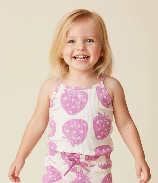 Regata infantil confeccionada em algodão certificado bci, com textura canelada, alças finas e estampa de moranguinhos,