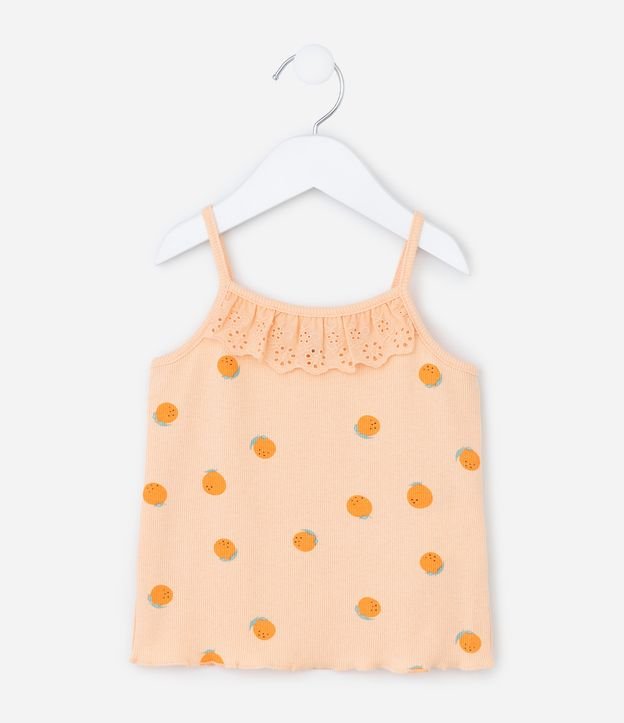 Regata infantil confeccionada em ribana mais sustentável. Possui gola redonda, alças finas, babadinho broderie e estampa de laranjinhas.