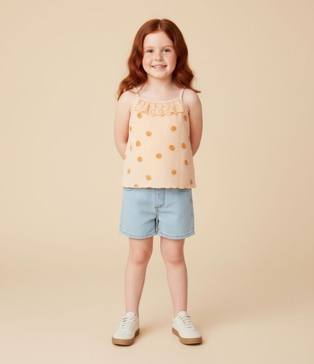 Regata infantil confeccionada em ribana mais sustentável. Possui gola redonda, alças finas, babadinho broderie e estampa de laranjinhas.