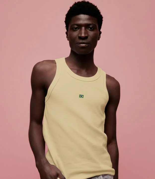 Regata muscle masculina confeccionada em ribana de algodão, com gola redonda e bordado localizado da bandeira do Brasil. Modelagem sem mangas, ideal para compor looks casuais com conforto e estilo. Confeccionado em algodão de certificado BCI, garantindo práticas sustentáveis.
