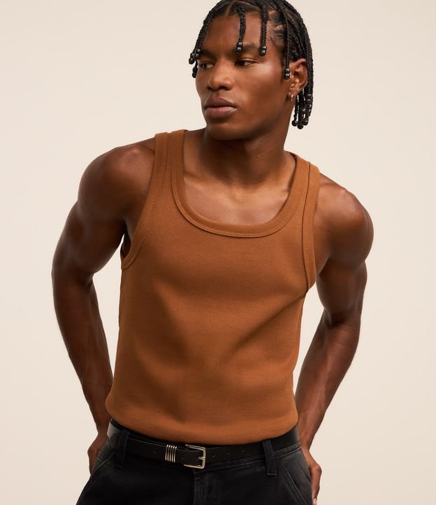 Regata regular masculina confeccionada em malha ribana de algodão, básica e sem estampa. Possui alças médias e comprimento alongado.